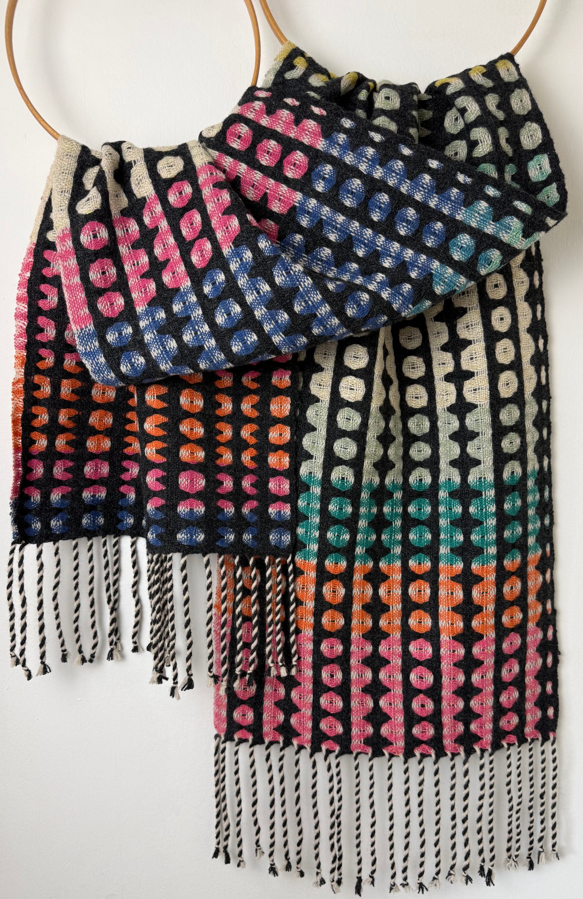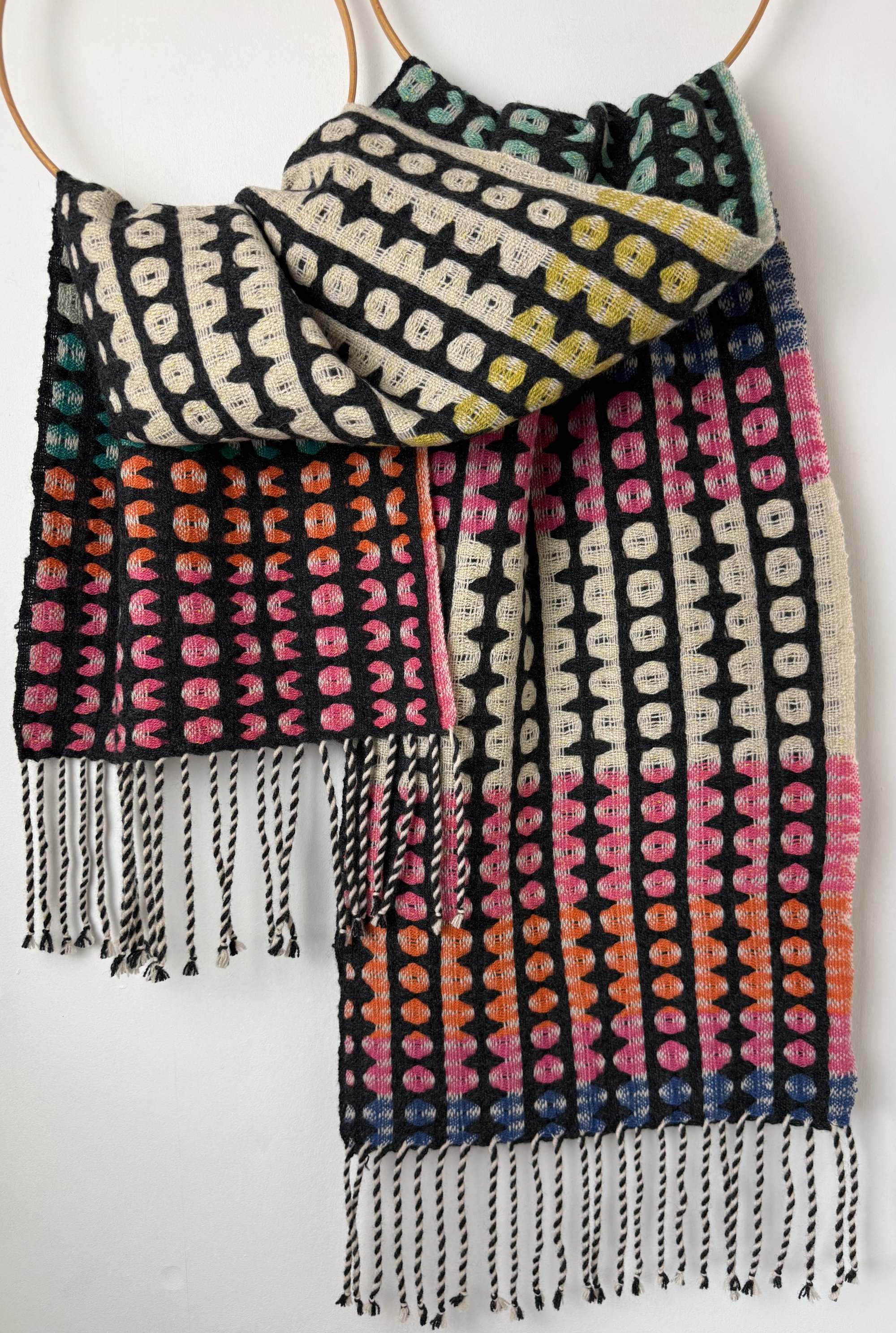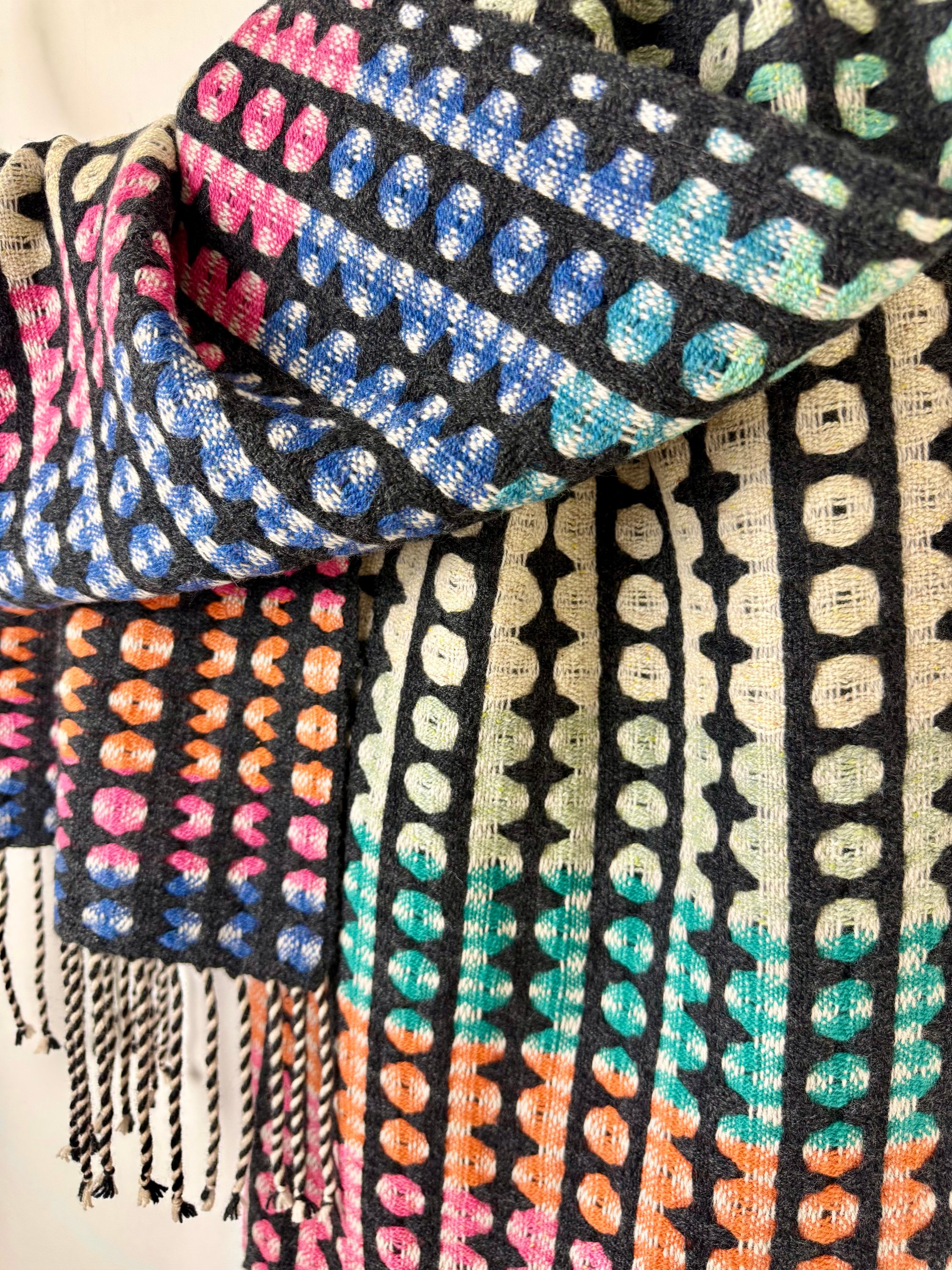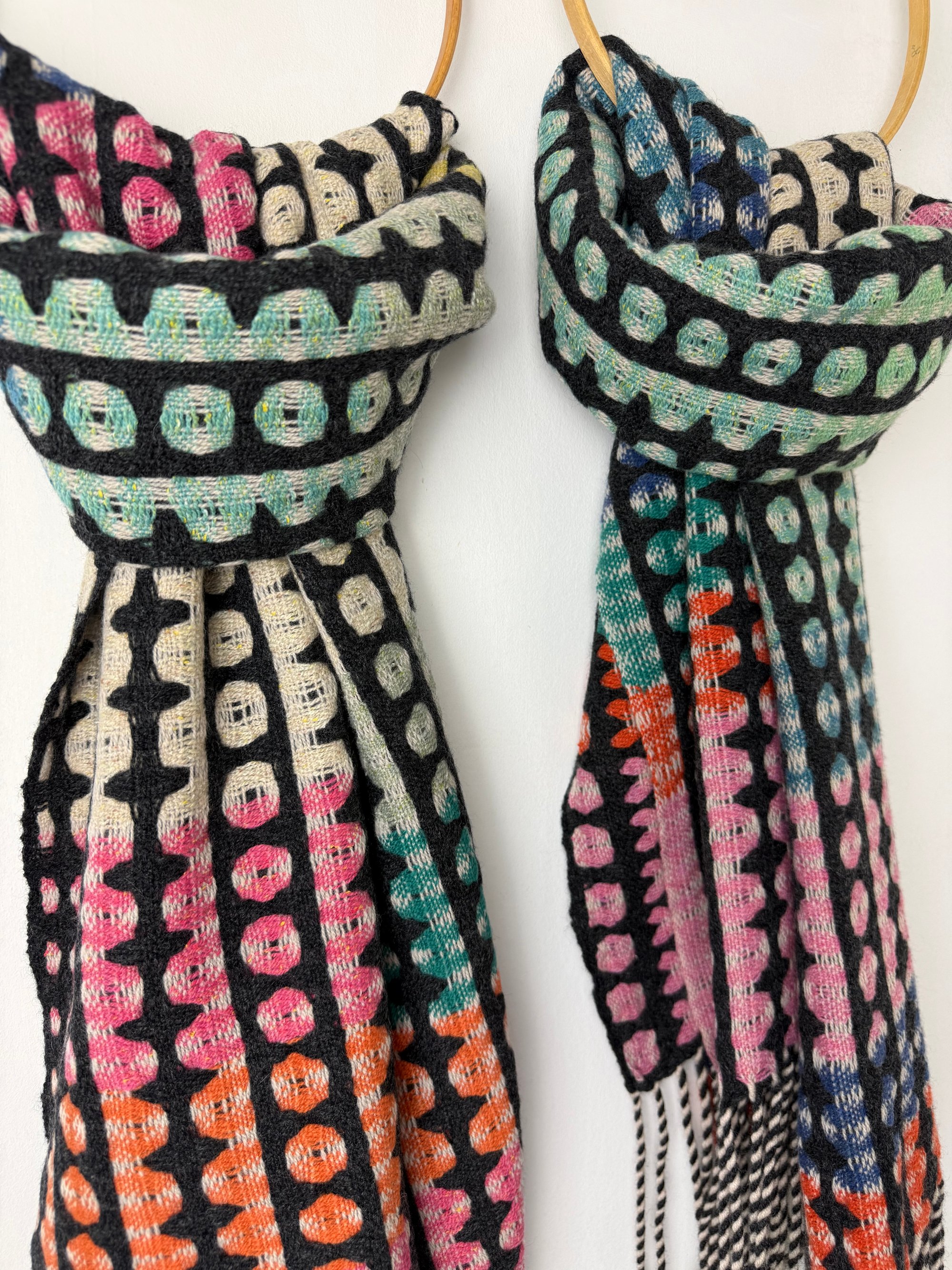 100% lambswool and silk scarf hand woven on my dobby loom in my garden studio overlooking the North Cornwall coastline.
