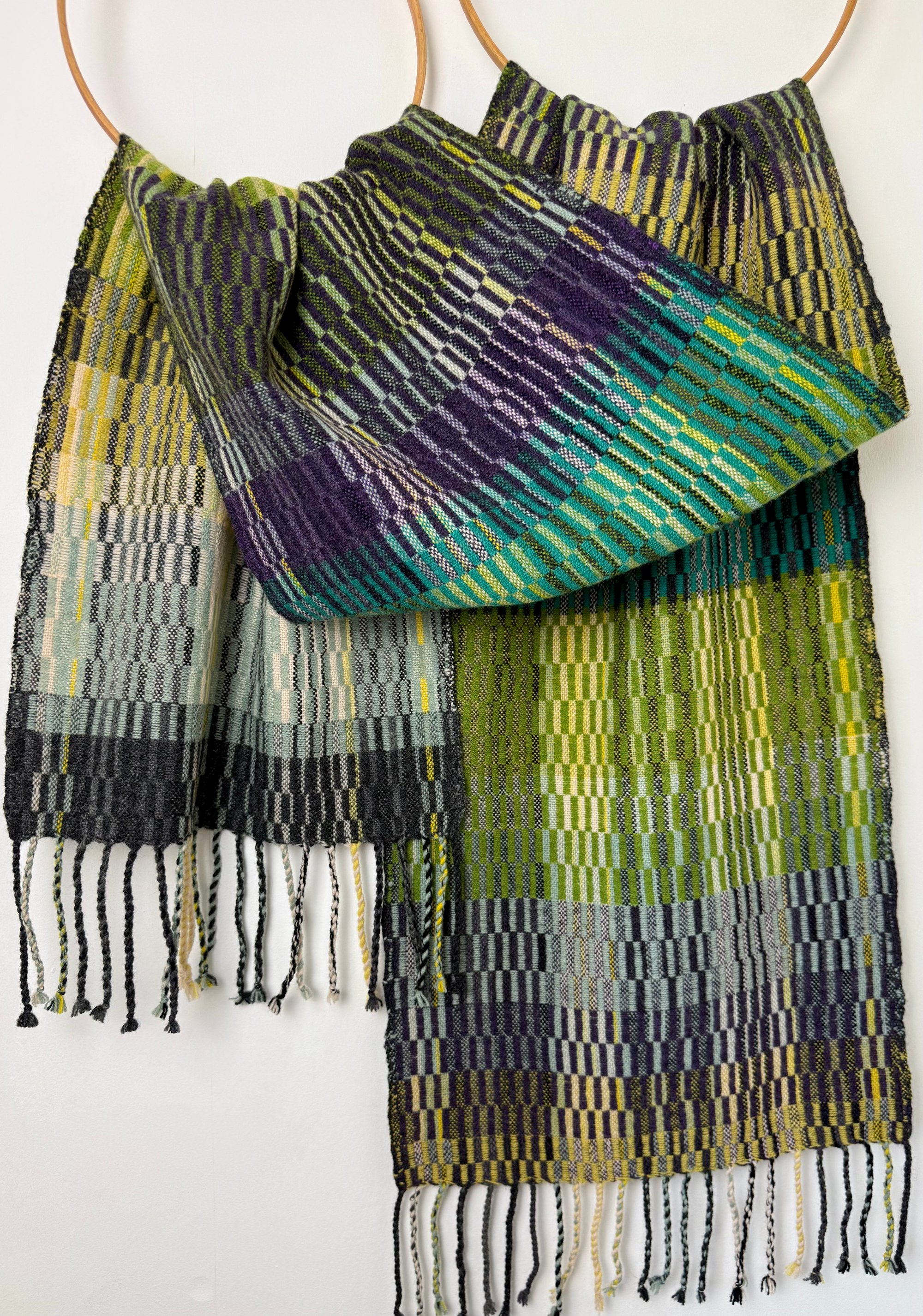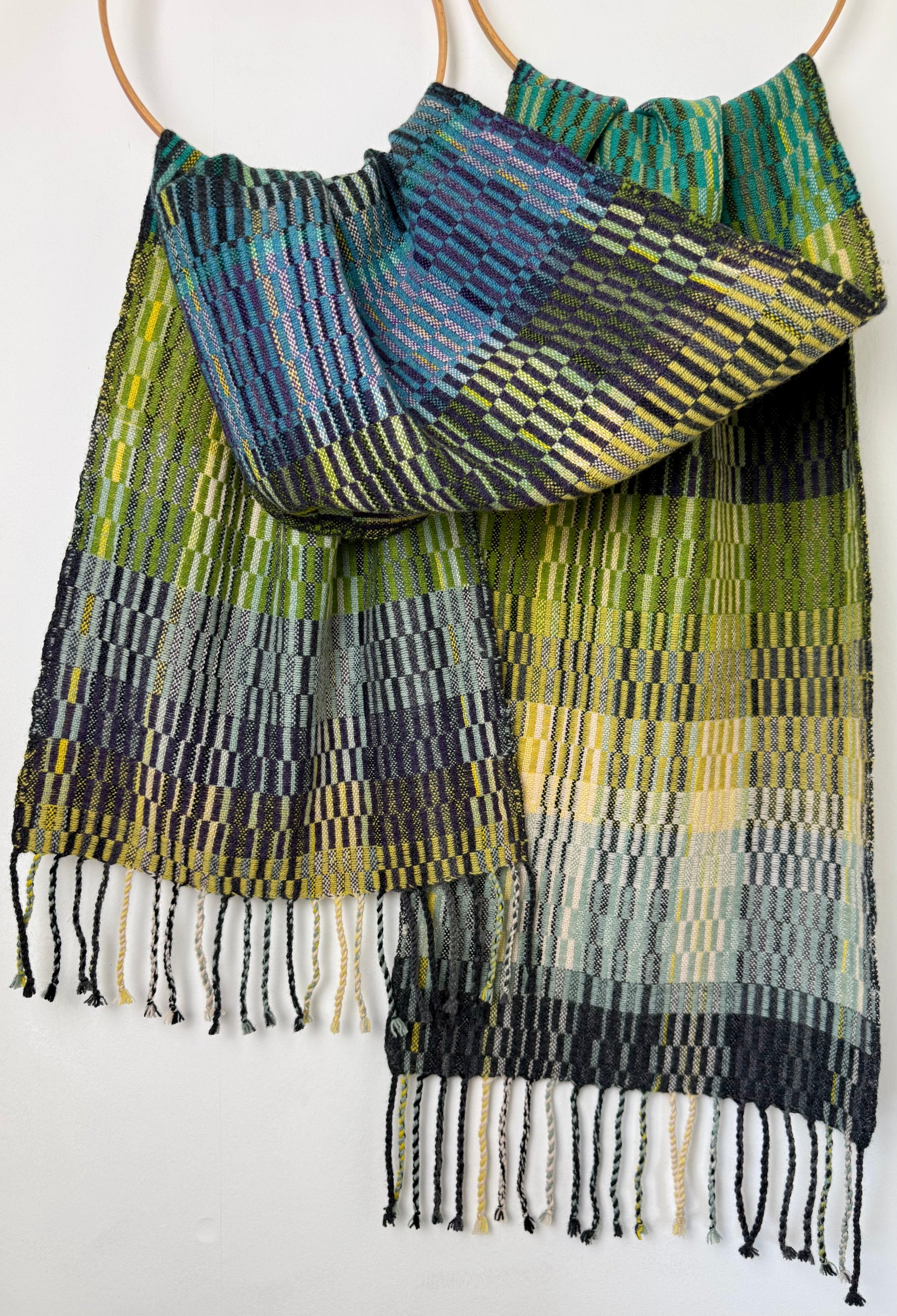 100% lambswool scarf/shawl, hand woven on my preloved floor loom in my garden studio overlooking the North Cornwall coastline.